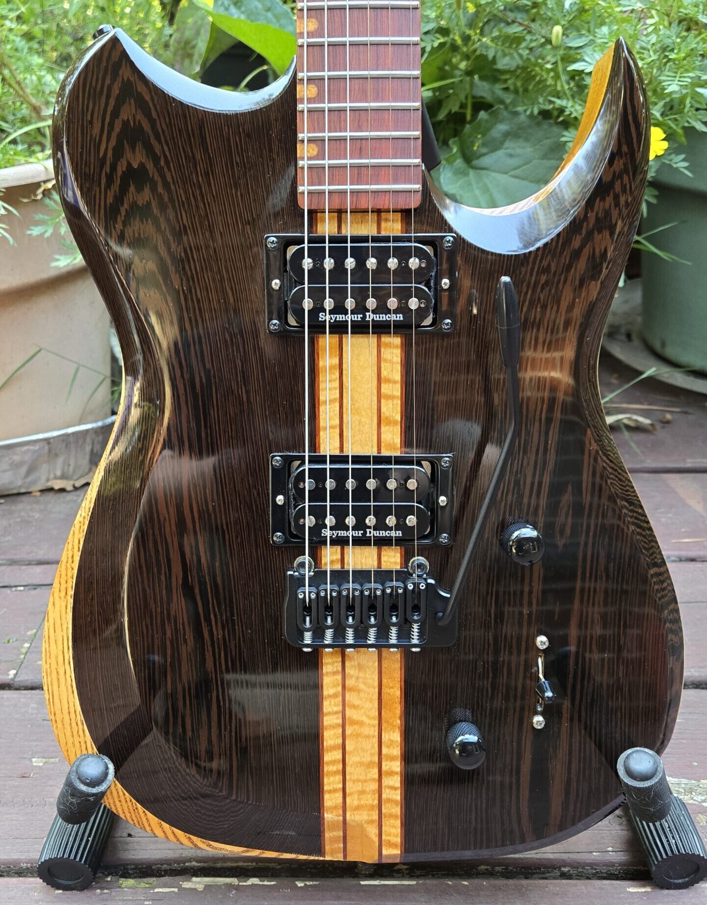 Handcrafted 6-string solid body electric guitar – wenge top, ash back, Seymour Duncan pickups, Hipshot hardware, blood wood fretboard, and carved for comfort.